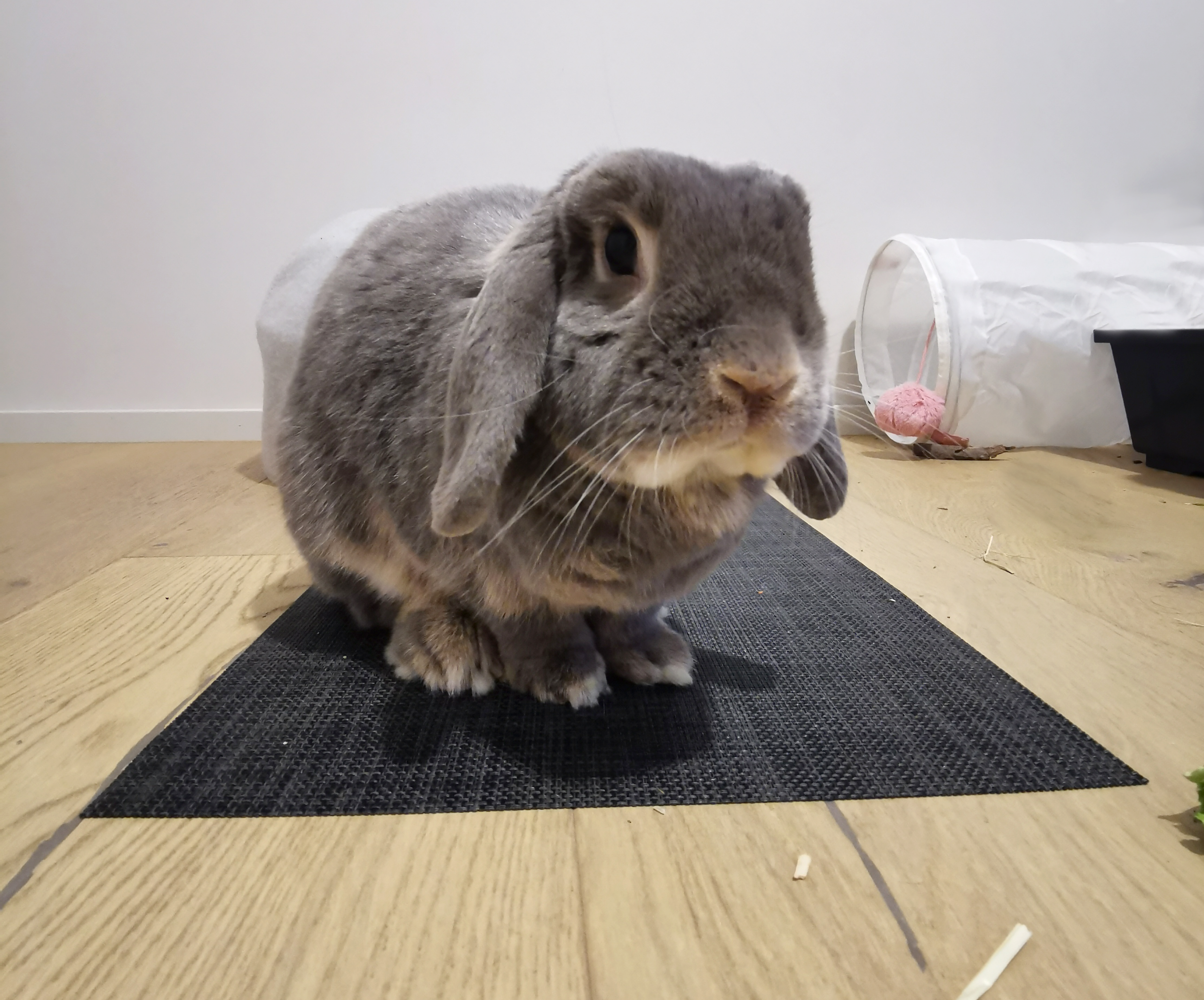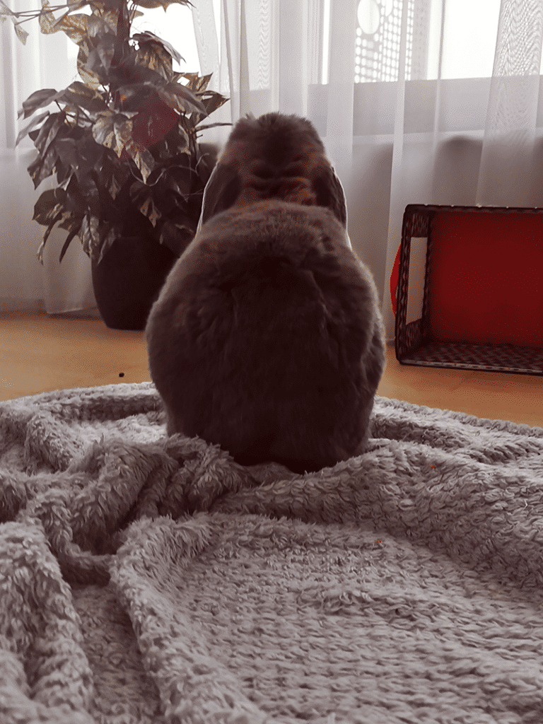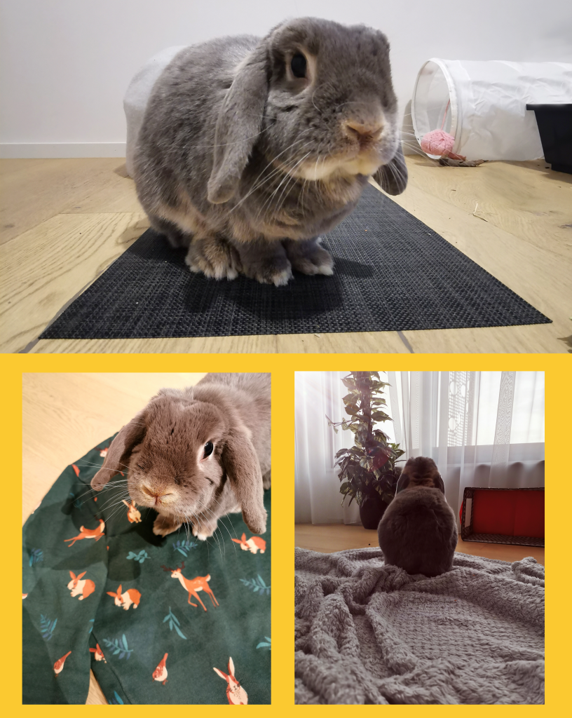 Faé came over, laid down on it… and stayed there, completely content — like it was her very own cozy little mat. 🐰